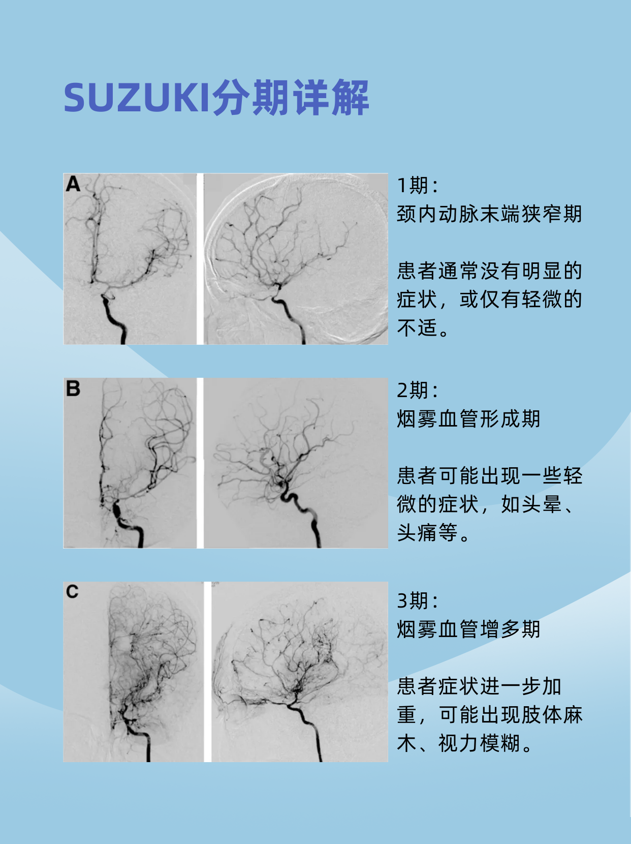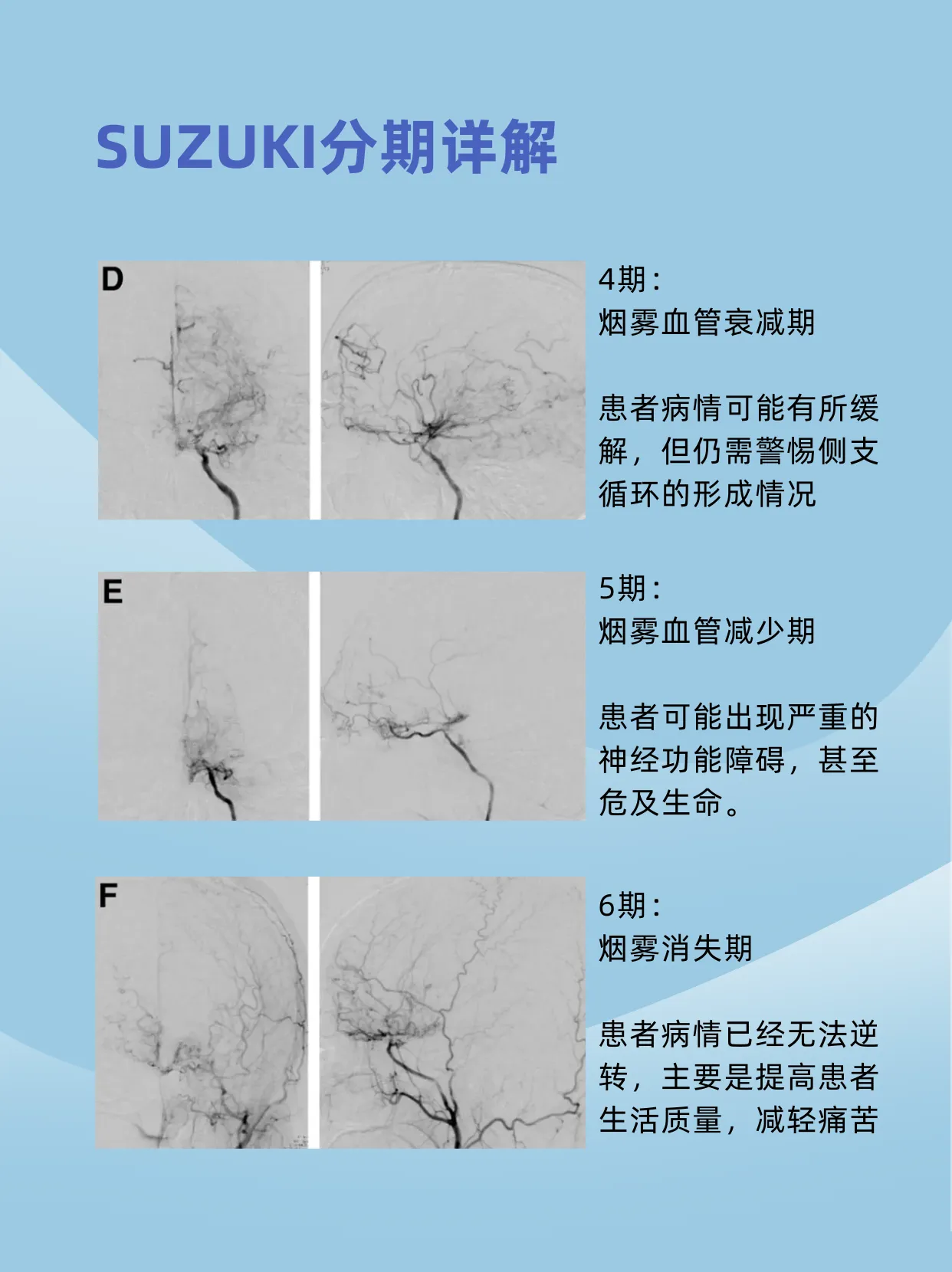 •指导治疗:Ⅰ-Ⅲ期患者可能通过血管重建手术(如直接或间接搭桥术)改善脑血流;Ⅳ期以后手术效果可能受限,需结合具体情况评估。