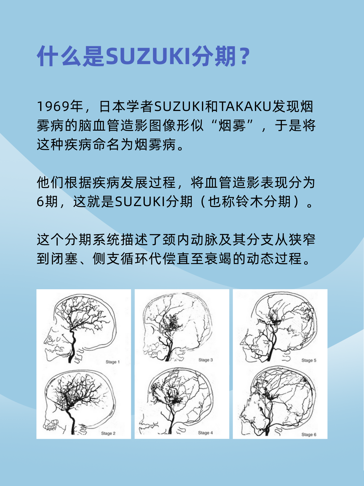 1969年,日本学者Suzuki和Takaku发现烟雾病的脑血管造影图像呈现独特的“烟雾状”血管形态,并将该疾病命名为“烟雾病”。他们根据病变发展过程,将脑血管造影表现分为6期,即Suzuki分期(亦称铃木分期)。该分期系统描述了从颈内动脉及其分支进行性狭窄、闭塞,到侧支循环代偿建立直至衰竭的动态病理过程。